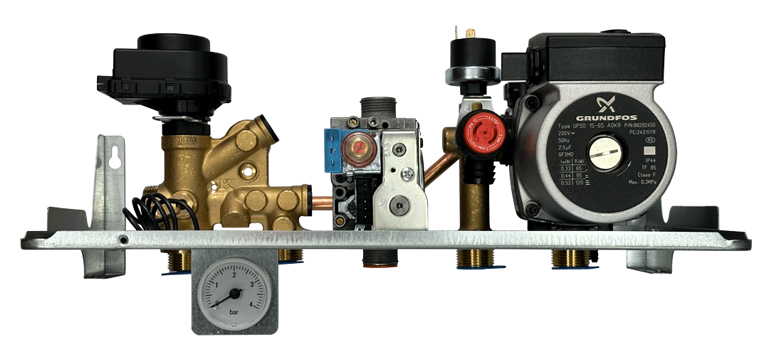 Многоскоростной насос от датского концерна Grundfos. Является критически важным элементом котла, так как работает практически в постоянном режиме и содержит вращающиеся механизмы. Изготовлен из самых надежных и дорогостоящих материалов: керамический вал, керамические подшипники, ротор в оболочке из нержавеющей стали, гильза ротора из нержавеющей стали, рабочее колесо из термостойкого композита, медная обмотка статора и др.